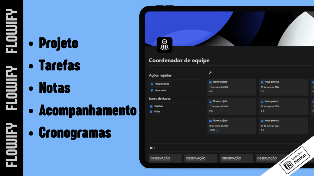 Maximize a eficiência da sua equipe com o nosso modelo Notion para coordenação de equipes! Criada para facilitar o gerenciamento de projetos, tarefas, anotações, acompanhamento e progresso, essa ferramenta é essencial para qualquer coordenador que queira manter sua equipe organizada e produtiva.