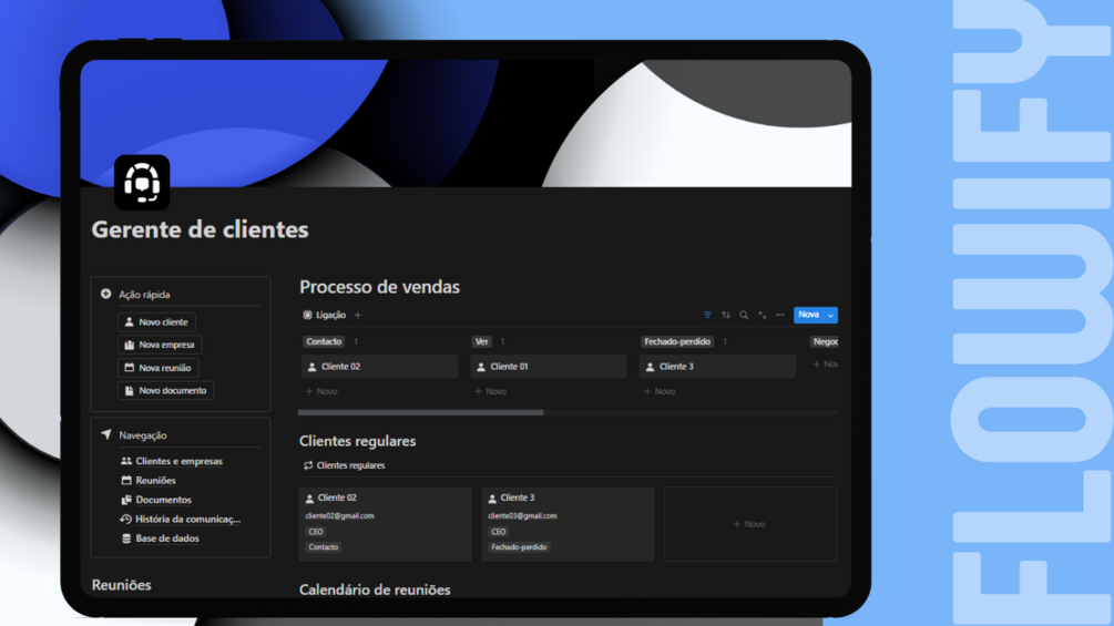 - Agendamento e controle de reuniões: Agende e organize reuniões com clientes, acompanhe os compromissos e garanta um serviço de qualidade.